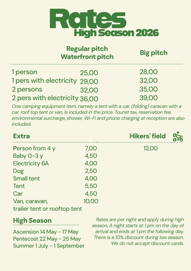 One camping equipment item, namely a tent with a car, (folding) caravan with a car, rooftop tent or van, is included in the price. Tourist tax, reservation costs, environmental surcharge, shower, Wi-Fi and phone charging at reception are also included.