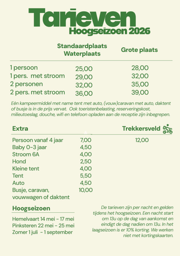 Zo betaal je bv. €36 voor een standaard- of waterplaats met 2 personen, kampeermiddel en stroom. In het laagseizoen ontvang je 10% korting.